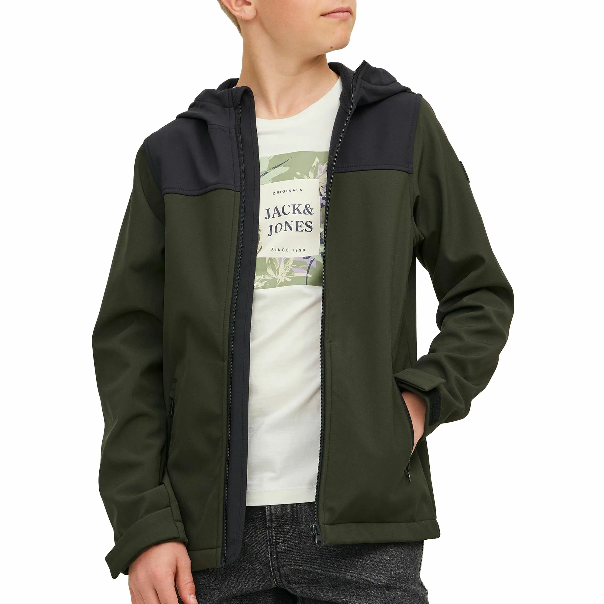 Die Jack & Jones Essential Marvin Softshelljacke mit Kapuze für Kinder ist eine winddichte, nässeabweisende Jacke mit Kapuze und zwei Taschen.
