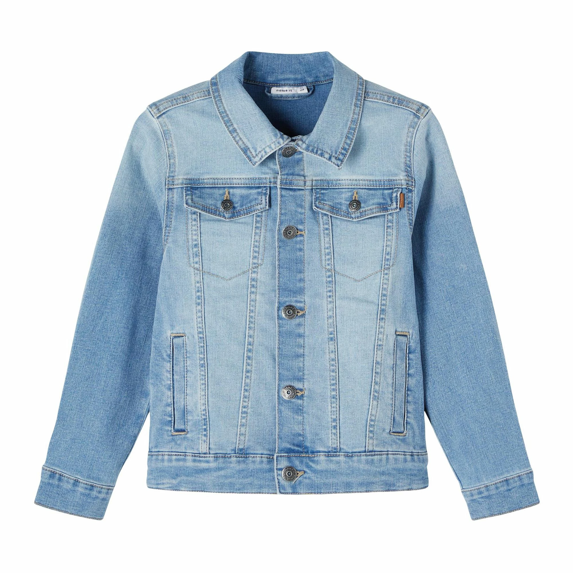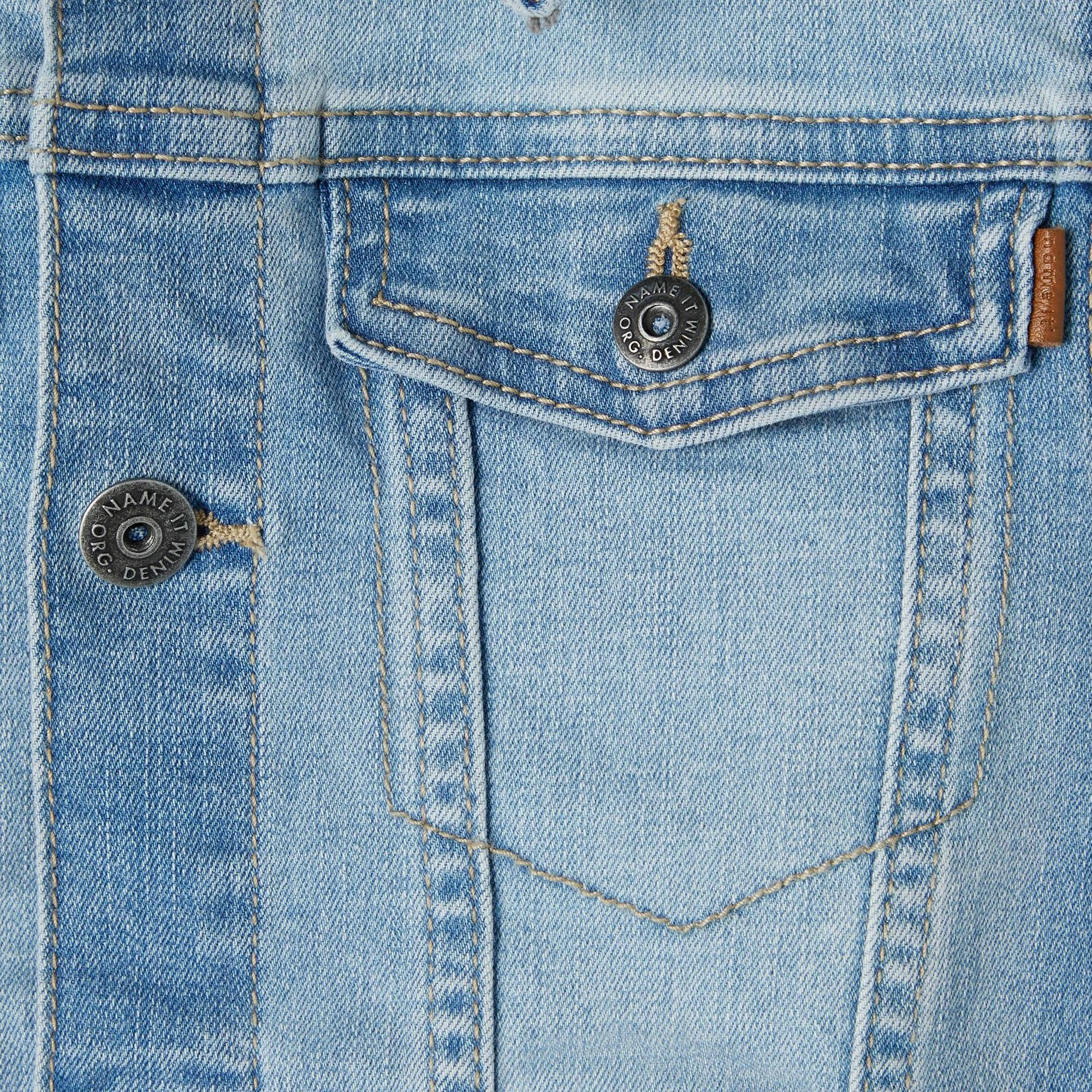 Die Name It Taul Denim Jeansjacke für Kinder ist eine modische Jeansjacke mit zwei Taschen und zwei Brusttaschen.