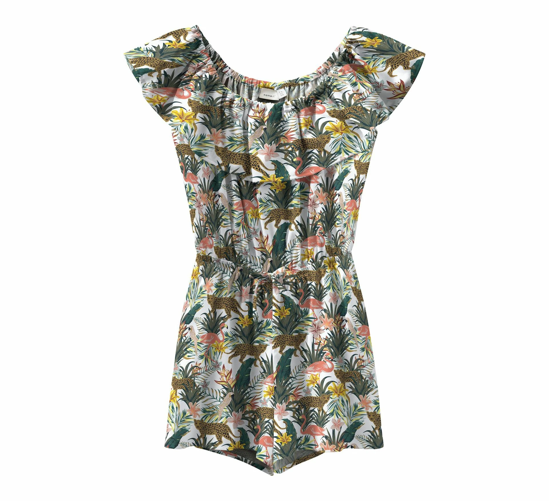 Das Name It Vinaya SS Printed Playsuit für Mädchen ist ein Kleid mit kurzen Ärmeln und einem auffälligen Jungleprint.