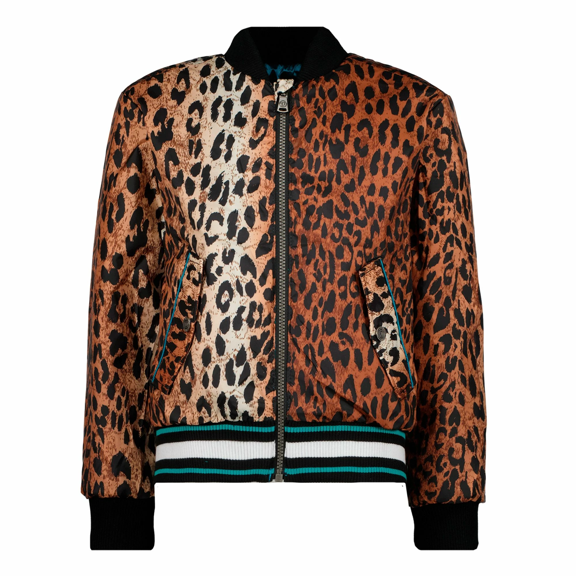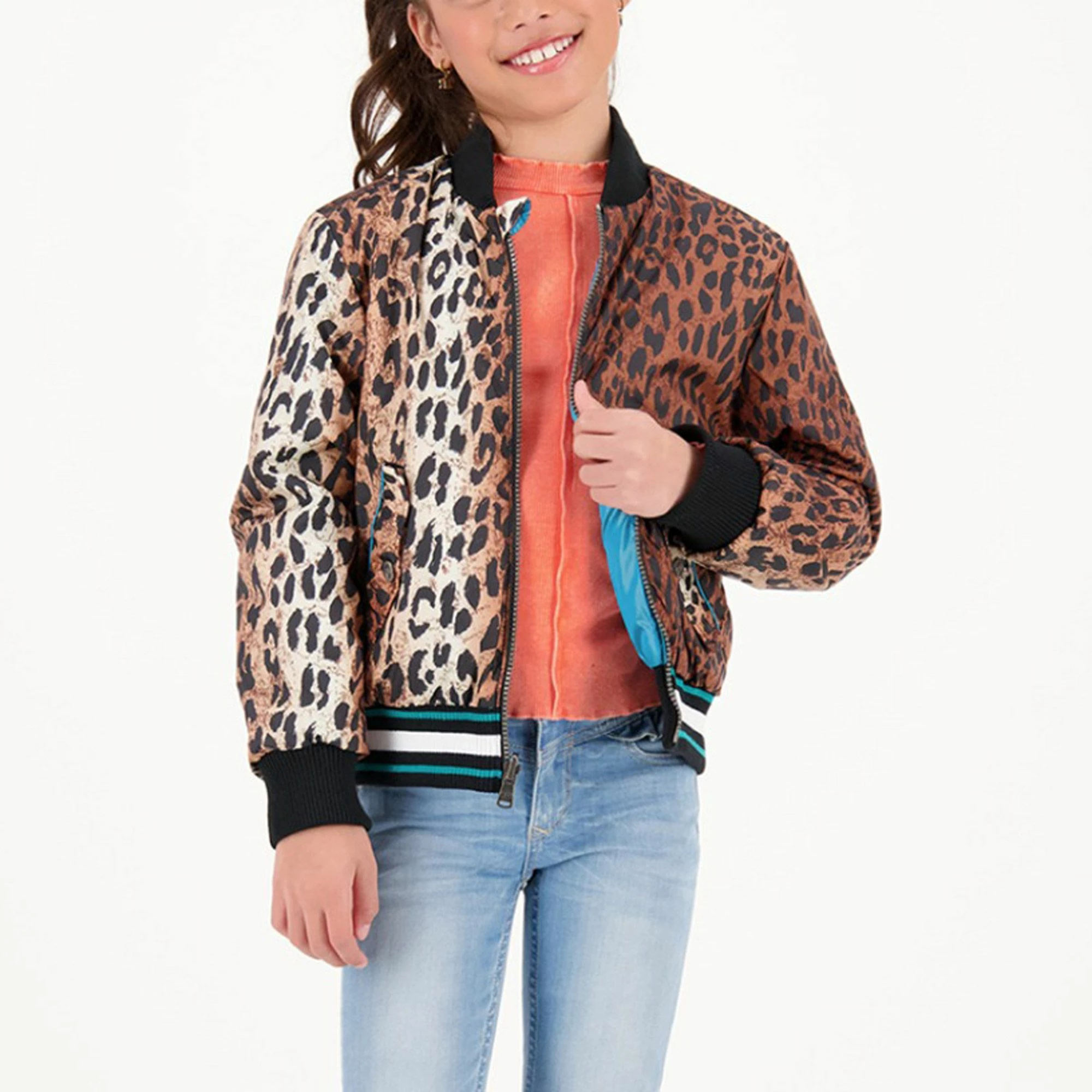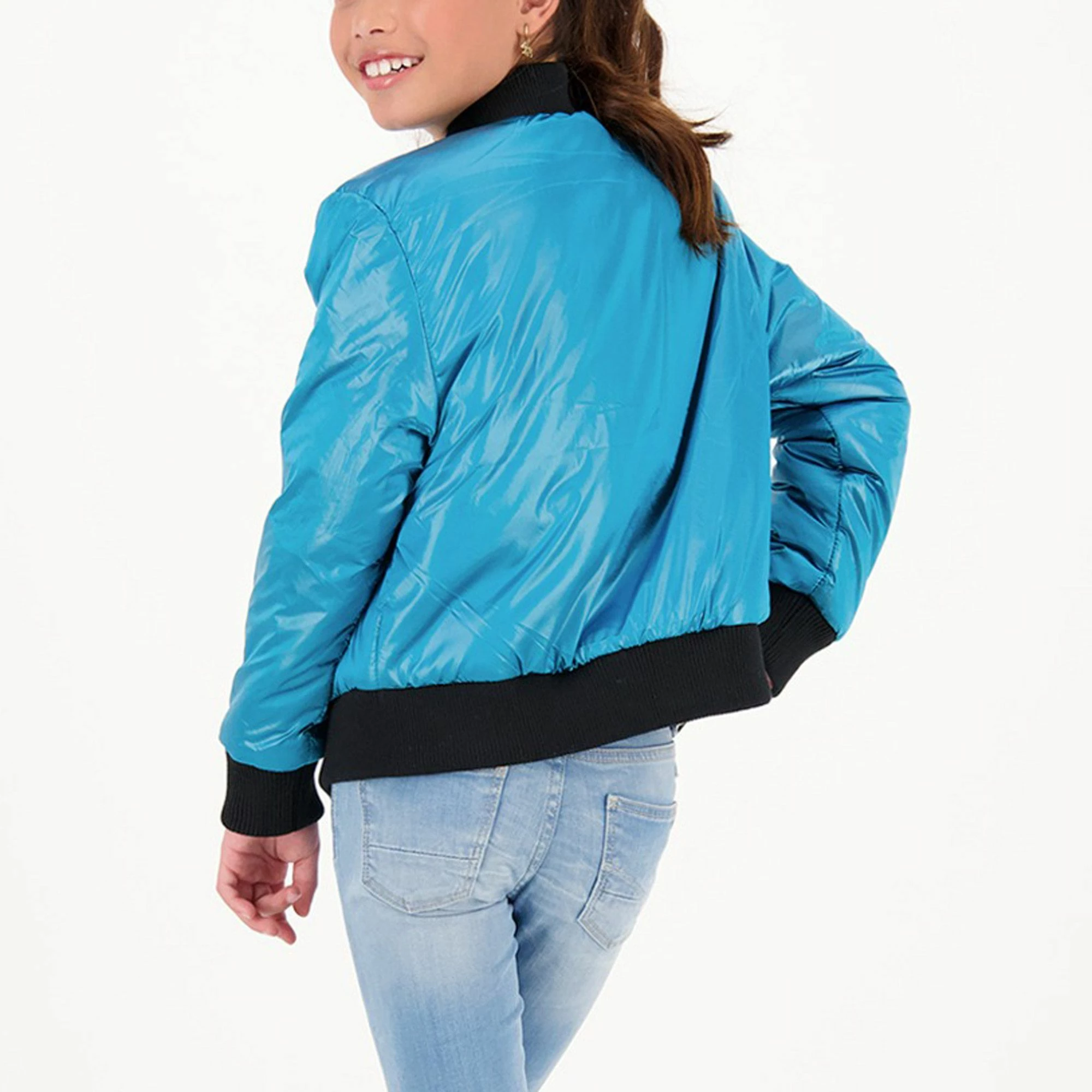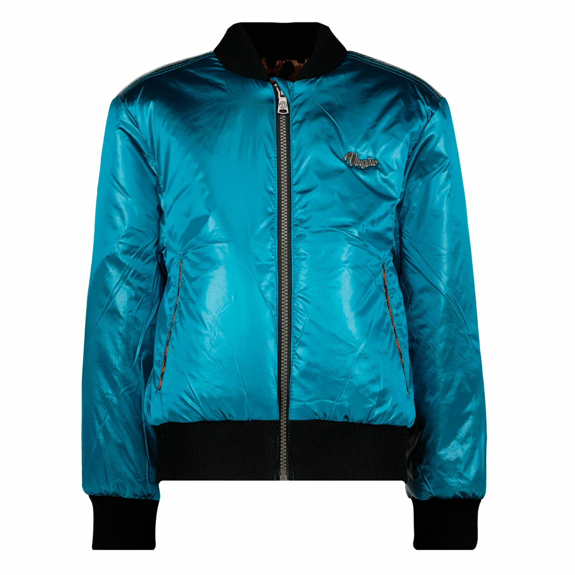 Die (reversible) Vingino Tarbara Jacke für Kinder ist beidseitig tragbar, hat zwei Jackentaschen und elastische Rippbündchen.